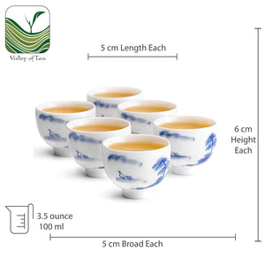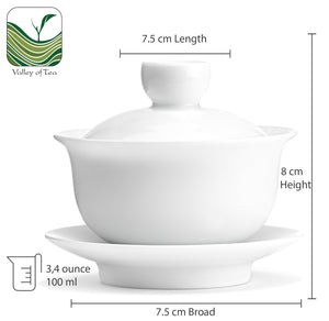 Contains a Gaiwan and 4 cups. Cups are artisanally made from Bone China in Jingdezhen China and are accompanied by one high quality glass pitcher.